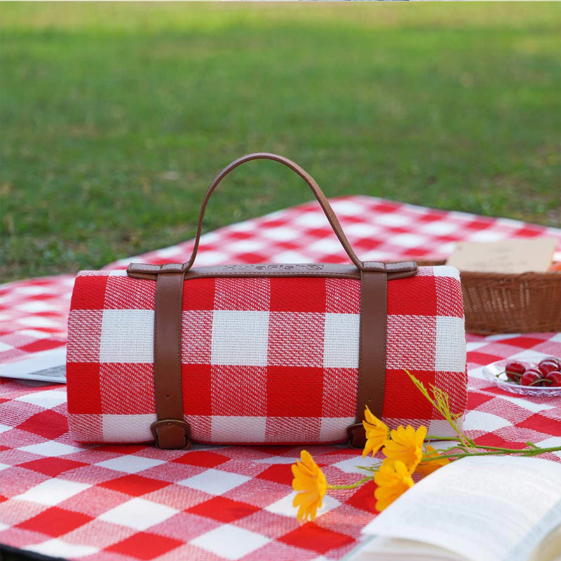 Foldable Waterproof Picnic Blanket for Outdoors with Luxury PU Leather Carrier, Large 3 Layered Picnic Rug Picnic Mat - Red
