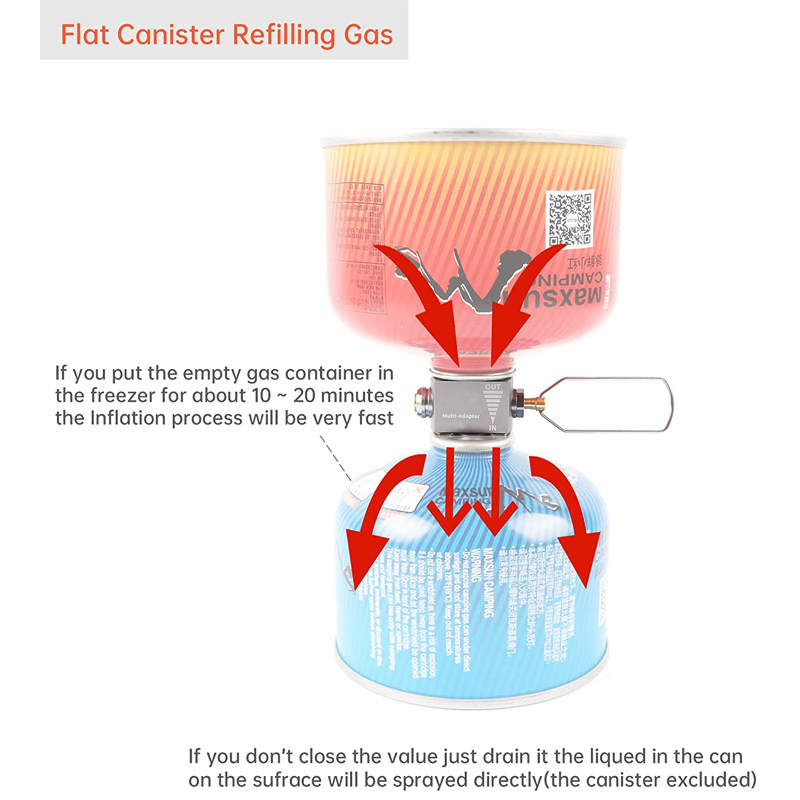 - Multifunction:The Canister refill adapter save fuel and save resources by collecting remaining gas.It can refill gas from isobutane fuel canister( EN417 Lindal Valve) to another isobutane canister.Comebine with butane adapter(V110)It can use the cheaper gas such as 8oz butane gas cartridge(nozlle bottle).Comebine with Propane adapter(V220)It can use the cheaper gas such as16oz small proppane tank.