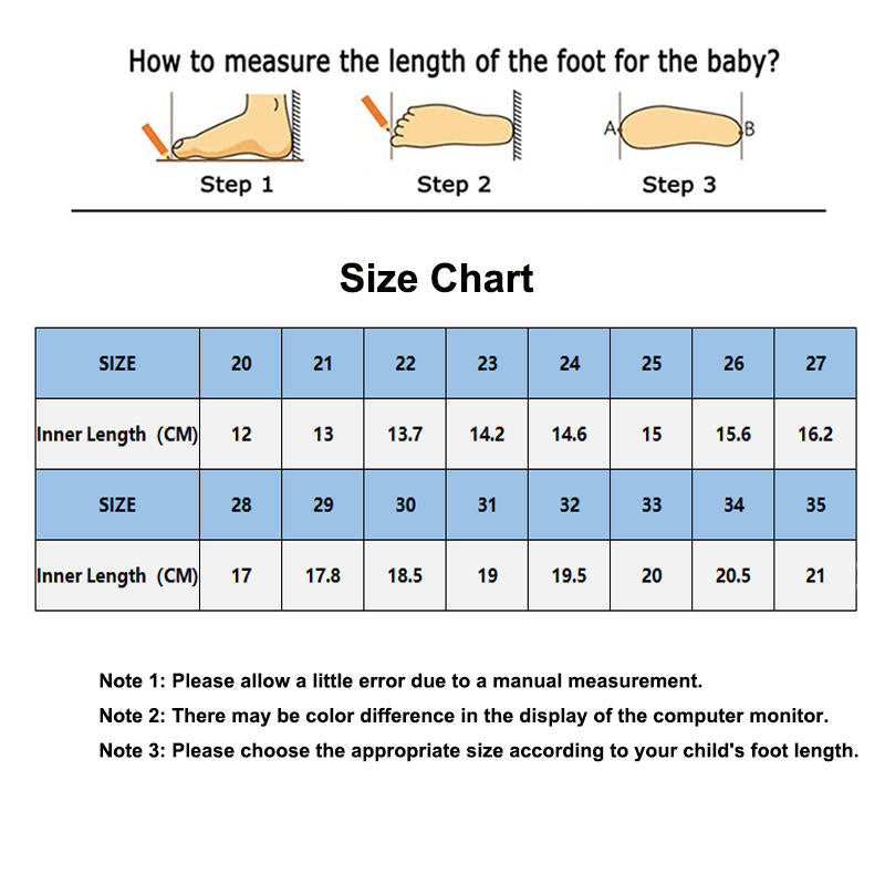- Please refer to the shoe size chart in the picture before buying shoes to get the correct size. Since the dimensions are manually measured, there may be some errors. Please measure the length of your child's feet to get the best fit. Due to the different display and lighting effects of the monitor, the picture may not reflect the actual color.
