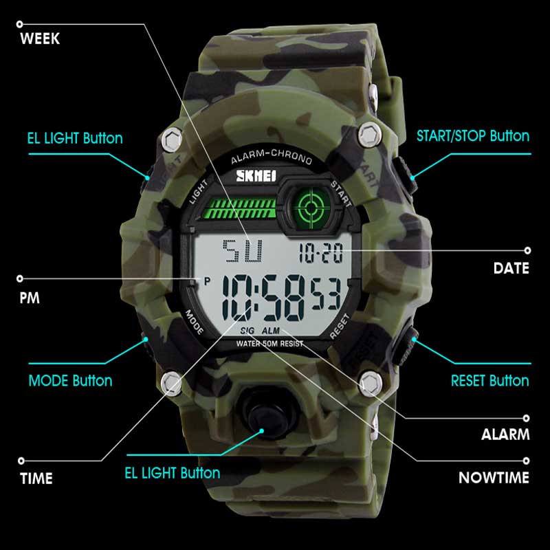 - Function: Stopwatch Timekeeping, Time, Display Date Day of the Week, Alarm Mode, 12/24 Hours,50m waterproof.
