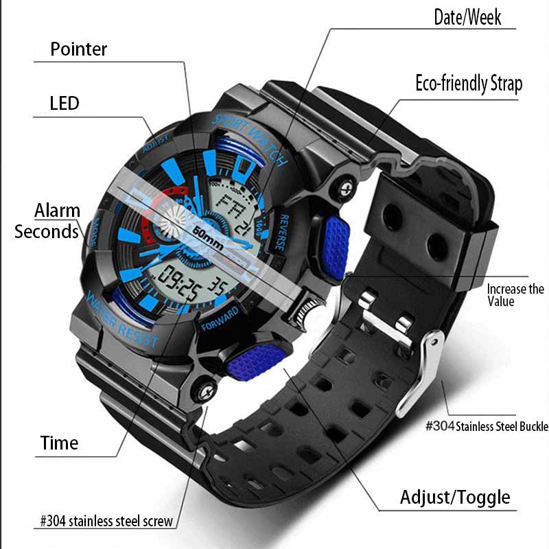 - Function: Chronograph, Date of Day Display, Timer Alarm, Luminous, 12/24 Hours.