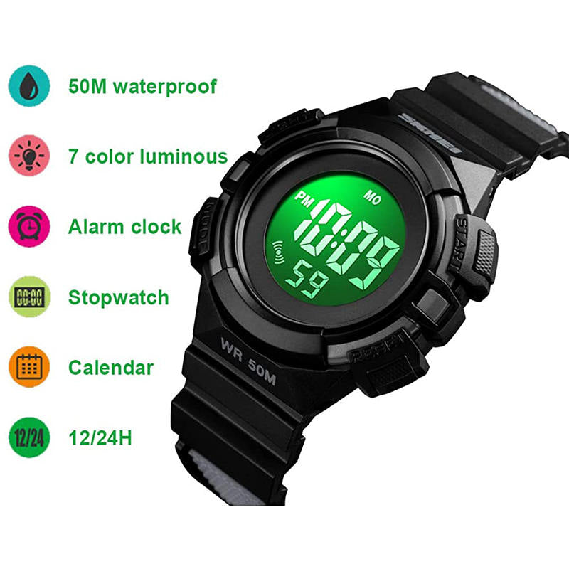 - Multi Function: 7 colors light, stopwatch, 50M waterproof, shockproof, calendar, alarm clock, week display, 12/24H