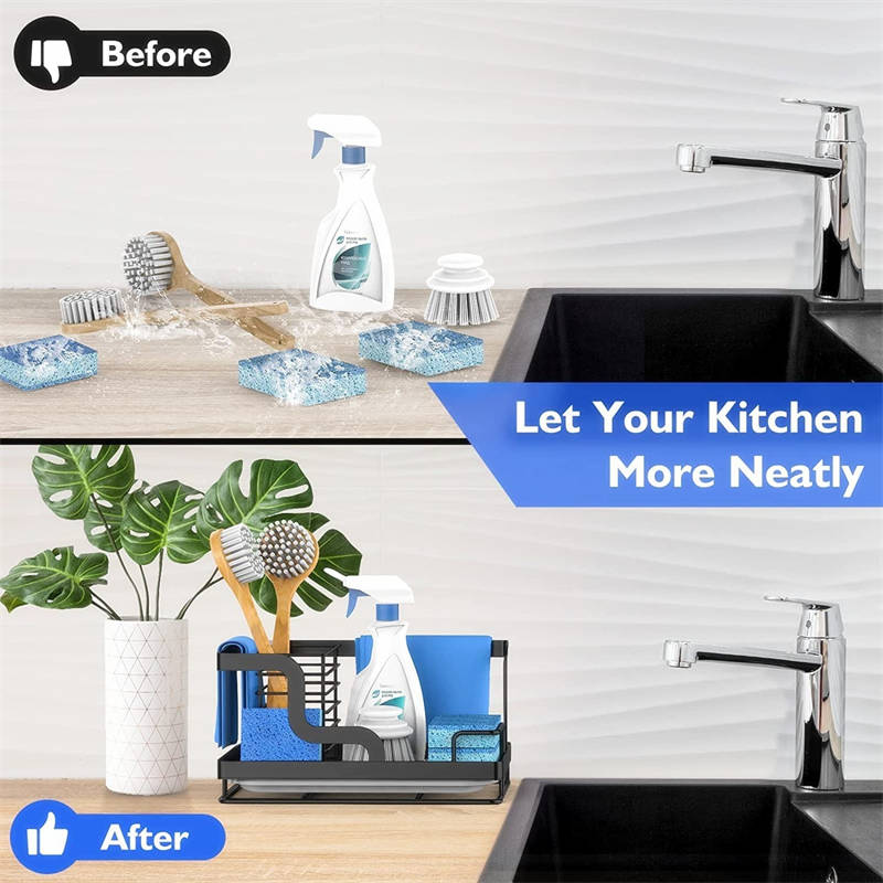 - Large Storage Space: This kitchen sink storage box has a novel design and can be more practical. Such as sponges, dish brushes, dish covers, dishcloths, bottles of hand sanitizer, etc. Dedicated hanger for better storage of wet rags.