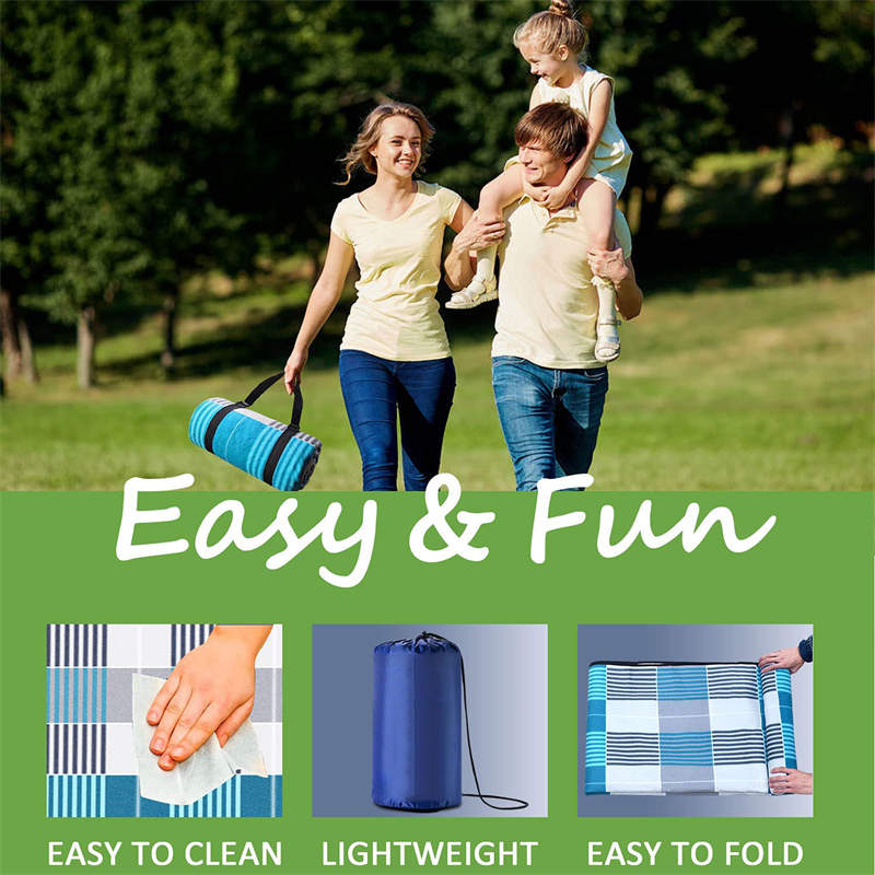 - Waterproof & Sandproof Picnic Blanke: Outdoor picnic blanket is completely waterproof and sandproof. This camping blanket provides superior protection from grass, sand, dirt, and rocks. You can easily shake off sand/grass or use a tissue/towel to absorb the liquid on the beach blanket. This waterproof picnic blanket prevents you from getting wet on damp lawns or surfaces.
