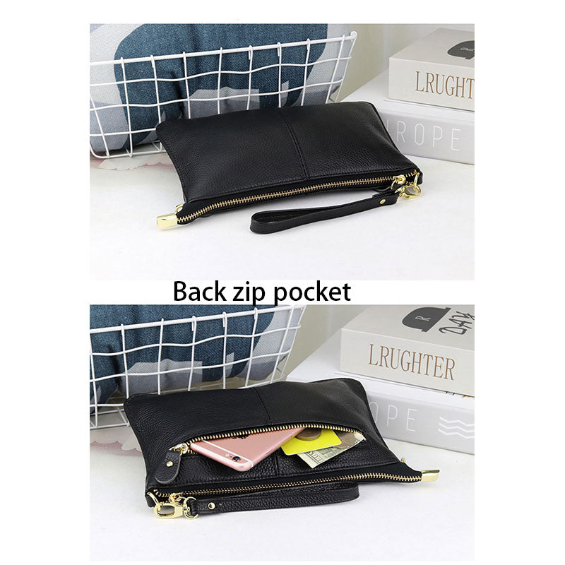 - this bag can be carried as a clutch without the need for a shoulder strap, wrist strap or cross-body, making it perfect for both dressy and casual looks. Material: cowhide, soft to the touch, silver hardware and brown fabric lining.