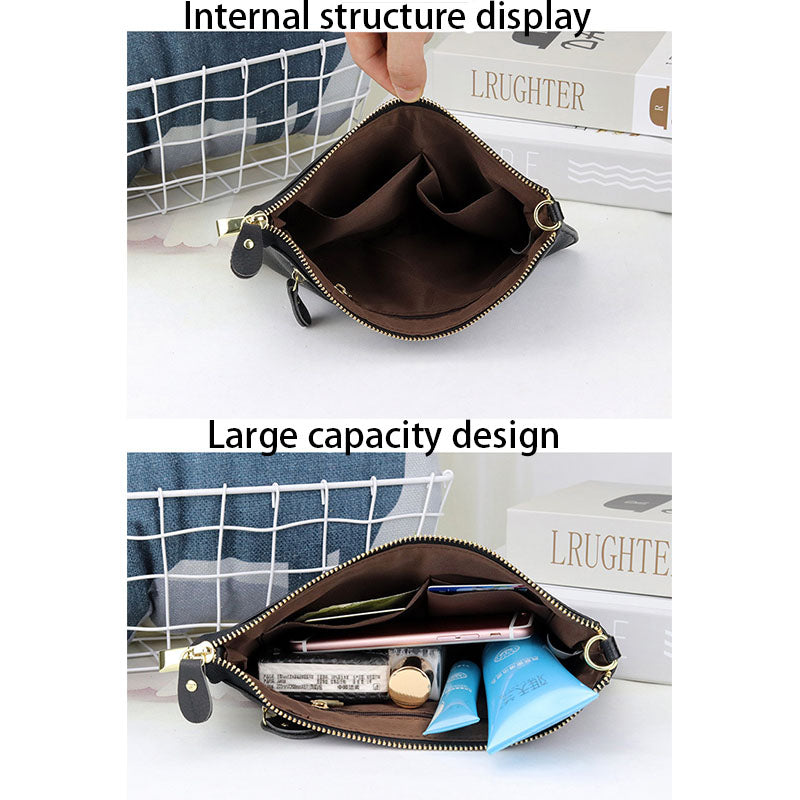 - this bag can be carried as a clutch without the need for a shoulder strap, wrist strap or cross-body, making it perfect for both dressy and casual looks. Material: cowhide, soft to the touch, silver hardware and brown fabric lining.
