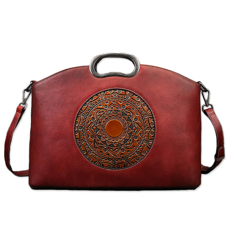 Leather Handbags for Women Vintage Embossing Totem Shoulder Bag-Red