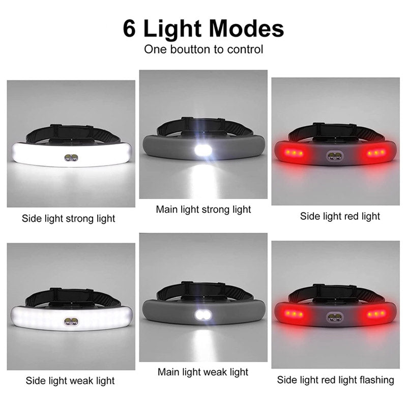 - White Light & Red Light Mode.This headlamp has 6 light modes: side light strong light,side light weak light,main light strong light,main light weak light,side light red light,side light red light flashing.Multi-functional light,one button control,convenient and quick.