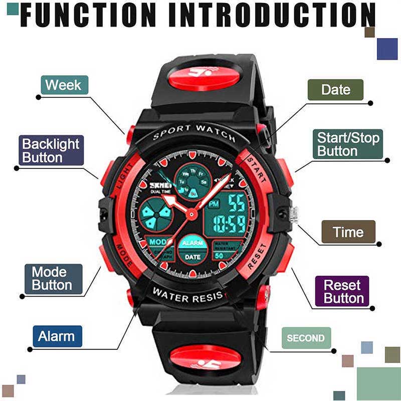 - Alarm Clock, Stopwatch, 50M Waterproof, Calendar, EL Backlight, 12H/24H time etc. This sport watch is perfect fit with all kinds of sports and it's really suitable for boys outdoor play.