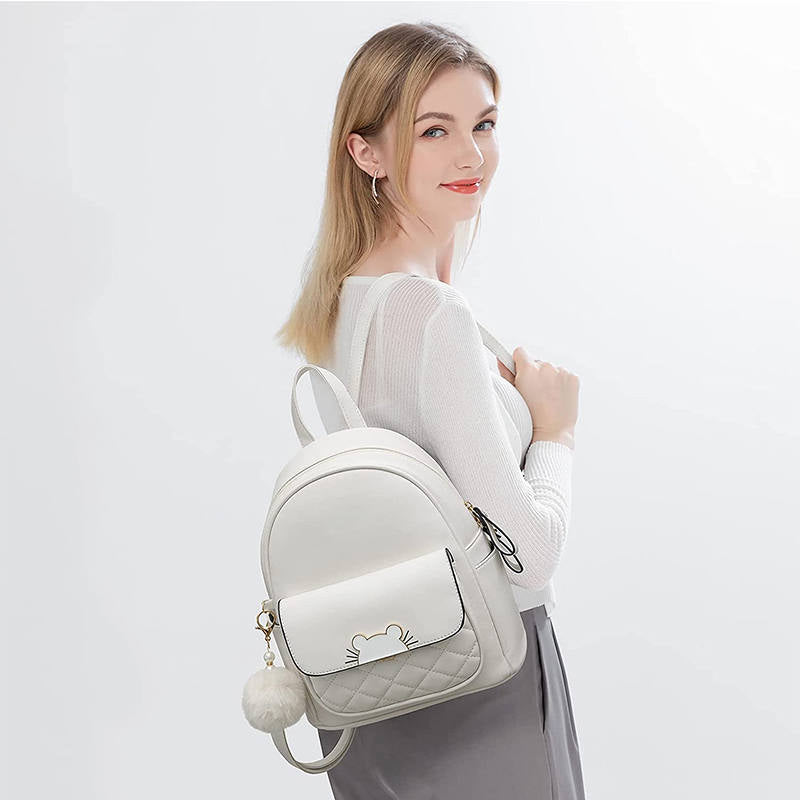 Mini Backpack for Women Cute Leather Small Bookbag with Cat Shaped Lock-White