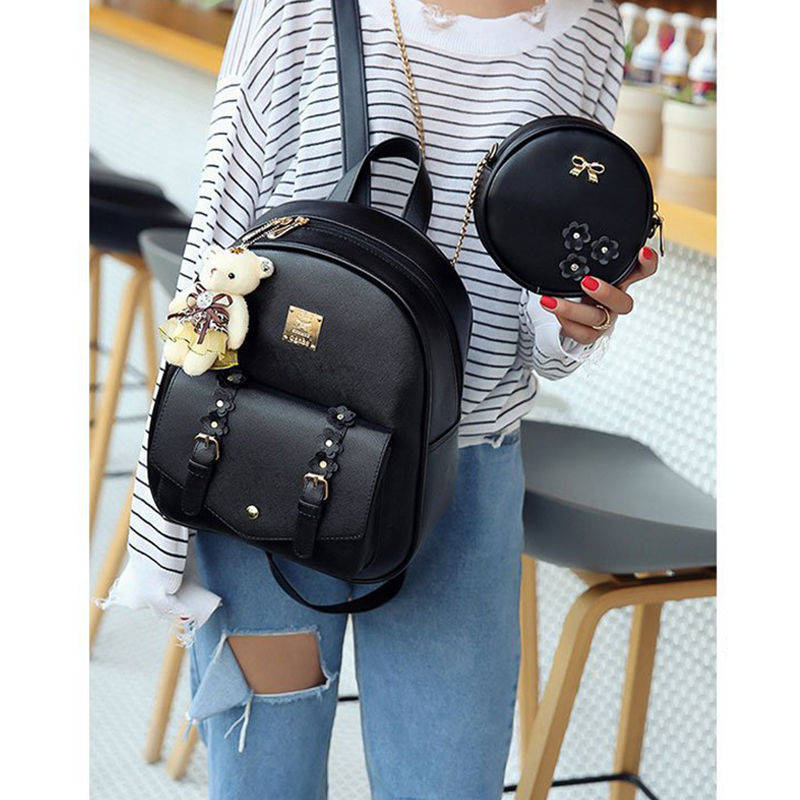 Mini Leather Backpack Purse 3-Pieces Fashion Flower Zipper Daypacks for Girls and Women-Black