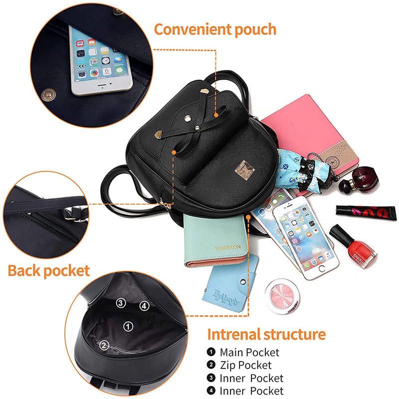 - Dimensions And Structure:(L X W X H)Bowknot leather backpack:26 X 12 X 30cm, Mini shoulder bag :15 X 6 X 15cm, Card wallet :7 X 1 X 11cm.Backpack contains 1 main compartment,1 front button pocket,1 zipper back pocket, 2 interior pocket,1 interior zipper pocket and with adjustable shoulder straps.