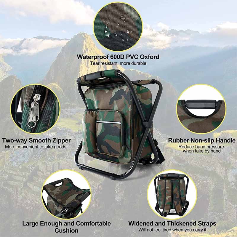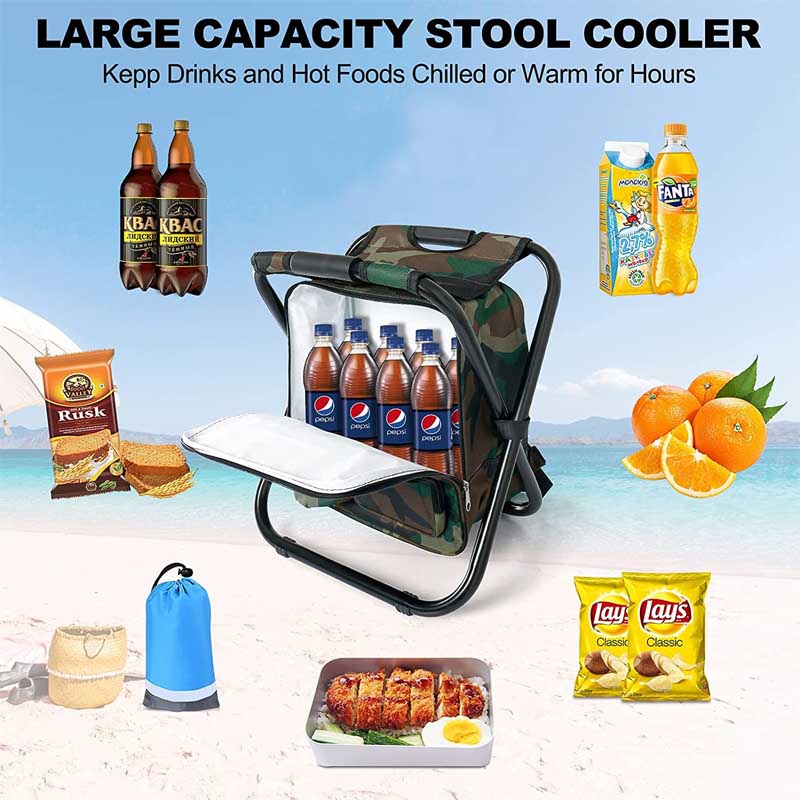 - Large Capacity Fishing Backpack Chair.The camping stool is offering loads of storage space with a variety of pockets,the inner cooler bag has a foil well-insulated cooler bag which can keeps food and drinks cold or warm a lot of hours.Wherever you go,you'll always have a seat for rest and cool drinks available.Two-way smooth zipper provide more convenient to take goods.The other mini pockets also are great for holding bottle, umbrella,key,wallet,power bank,and any other little stuffs.