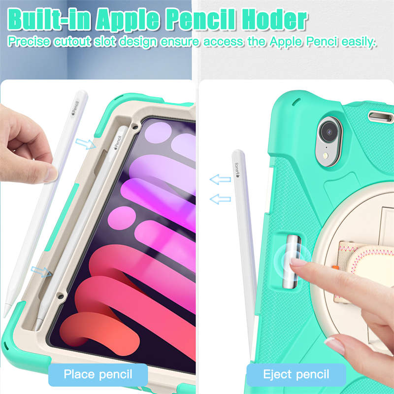 - The iPad Mini 6 case 2021 built-in 360-degree swivel foldable sturdy kickstand. It can support multi-angle (Vertical, Horizontal, Halfway between). Ideal for watching videos, conferences, typing and drawing, let your hands-free. This sturdy kickstand can be folded when you don't need it.