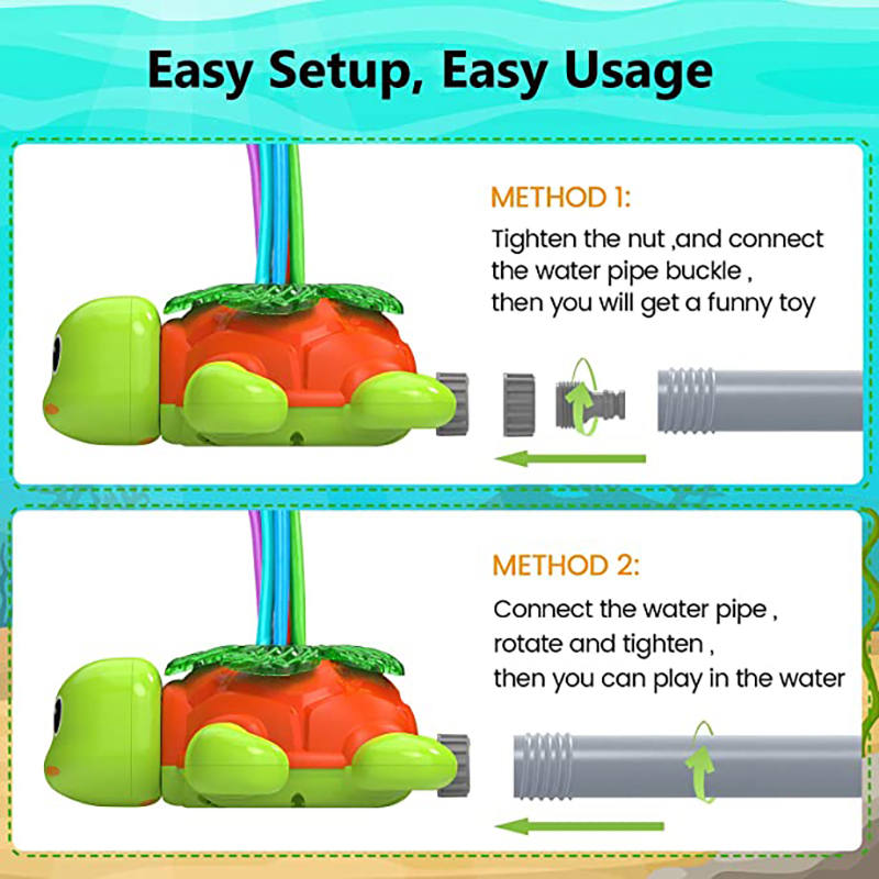 - Water Park: For the whole family, summer has never been so fun. Connect the rotating tortoise sprinkler to the hose and turn on the water and water at the same time and have fun. The spraying range of this outdoor sprinkler is very wide.