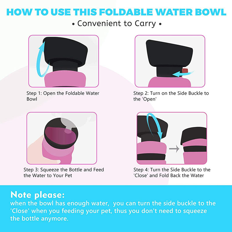 - Easy to use:exclusive patented design,according to other brands improvement,dog kettle and water bowl combo is. Folded cap can be used as a water bowl,you no longer need any external bowl to give furry partner to drink water. With one hand pressing water bottle,water will flow into the bowl. After drinking folded. It's that simple.
