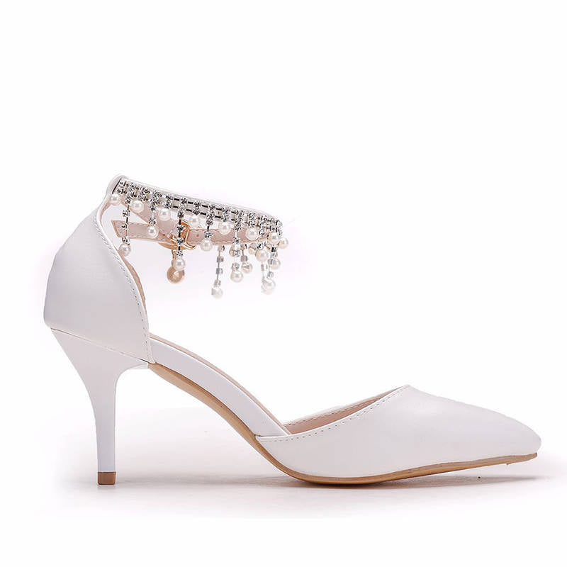 Pointed Toe 7.5cm High Heel Pearl Ankle Strap Wedding Dress Pump-White