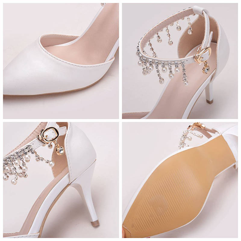 Pointed Toe High Heel Pearl Ankle Strap Wedding Dress Pump-White