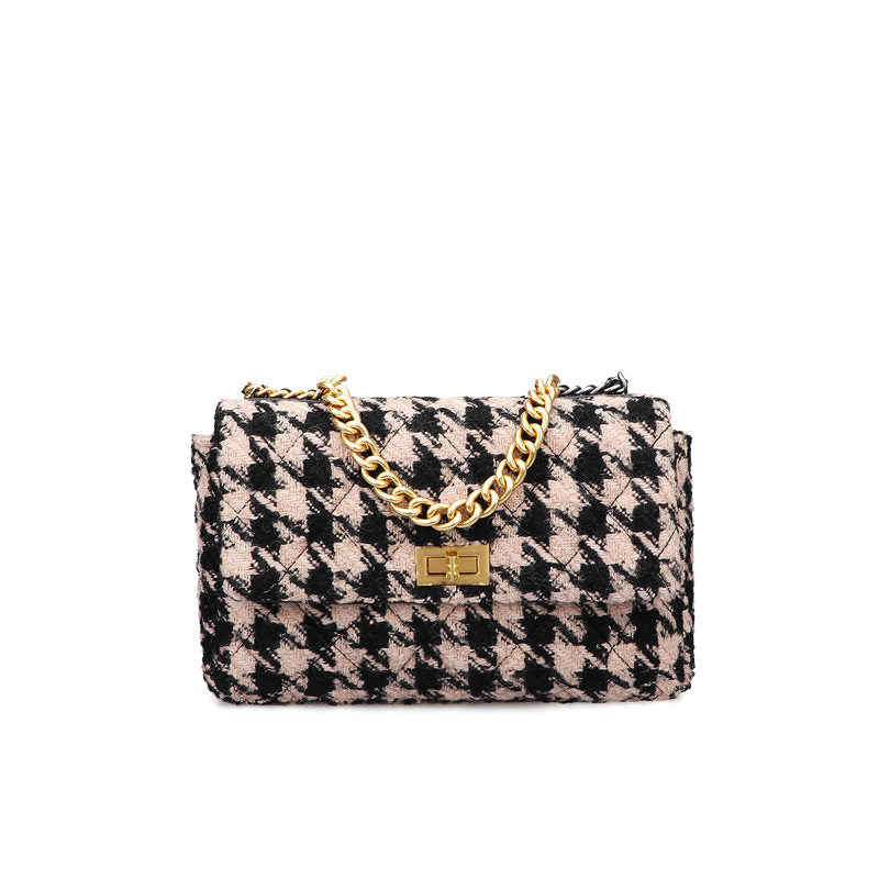 PU Leather Houndstooth Ladies Shoulder Bag Fashion Woolen Cloth Crossbody Bag-Apricot