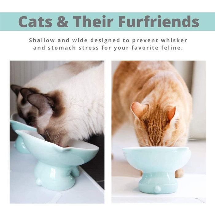 - When cat grow up until 5 months, maybe will noticed some cats lie on the floor to eat when use common food bowls or plates and that is not good for digestion.The comfortable raised design increases the height of the cat food bowls, reducing the pressure on the cat ?¡¥s neck and abdomen.