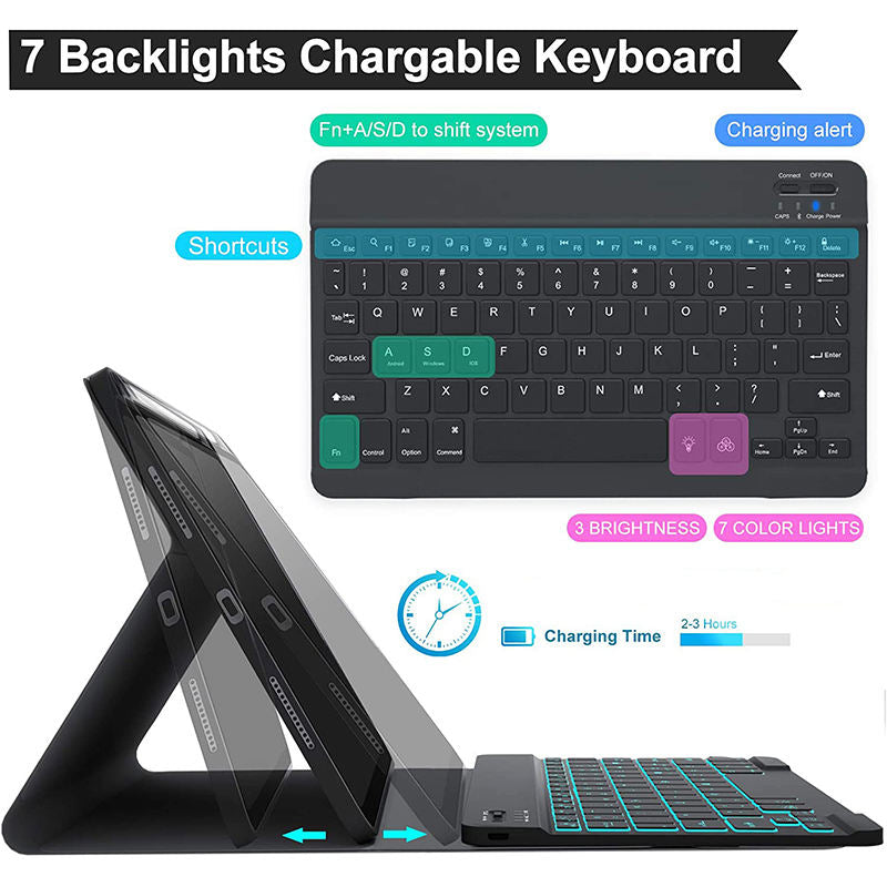 Removable Square Keyboard Case For iPad 7 Color Backlit with Pen Slot Wireless BT Lightweight Case-Black