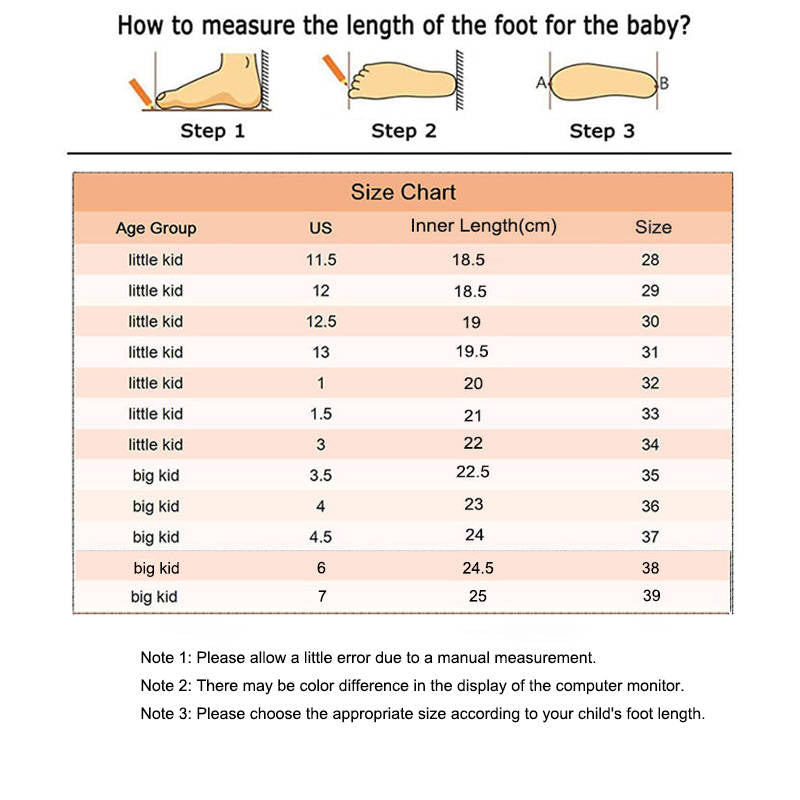 - Please refer to the shoe size chart in the picture before buying shoes to get the correct size. Since the dimensions are manually measured, there may be some errors. Please measure the length of your child's feet to get the best fit. Due to the different display and lighting effects of the monitor, the picture may not reflect the actual color.