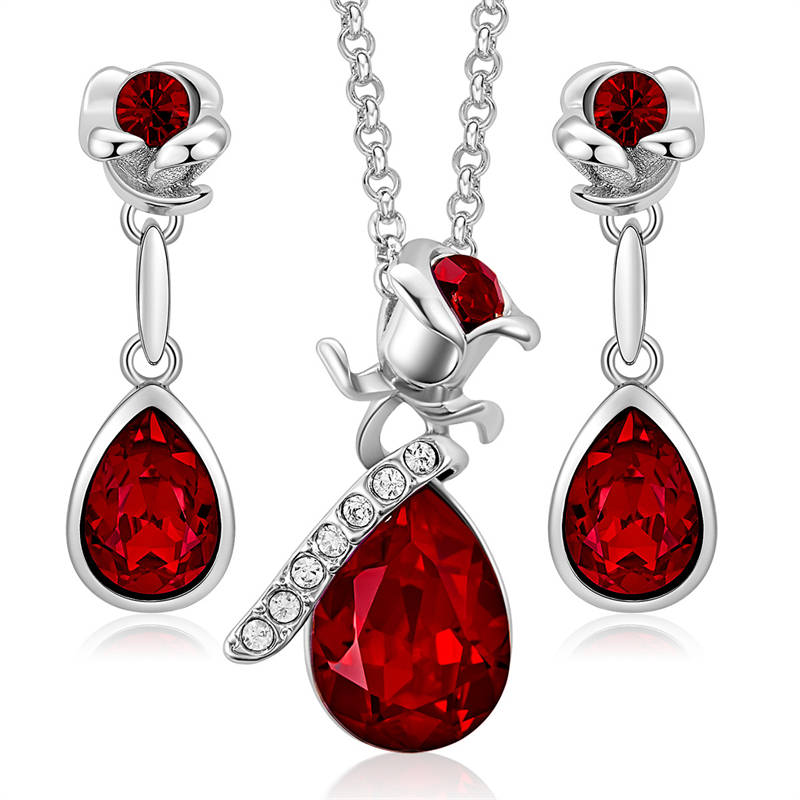 Rose Crystal Necklace and Earrings Set for Mom Wife-SilverRed