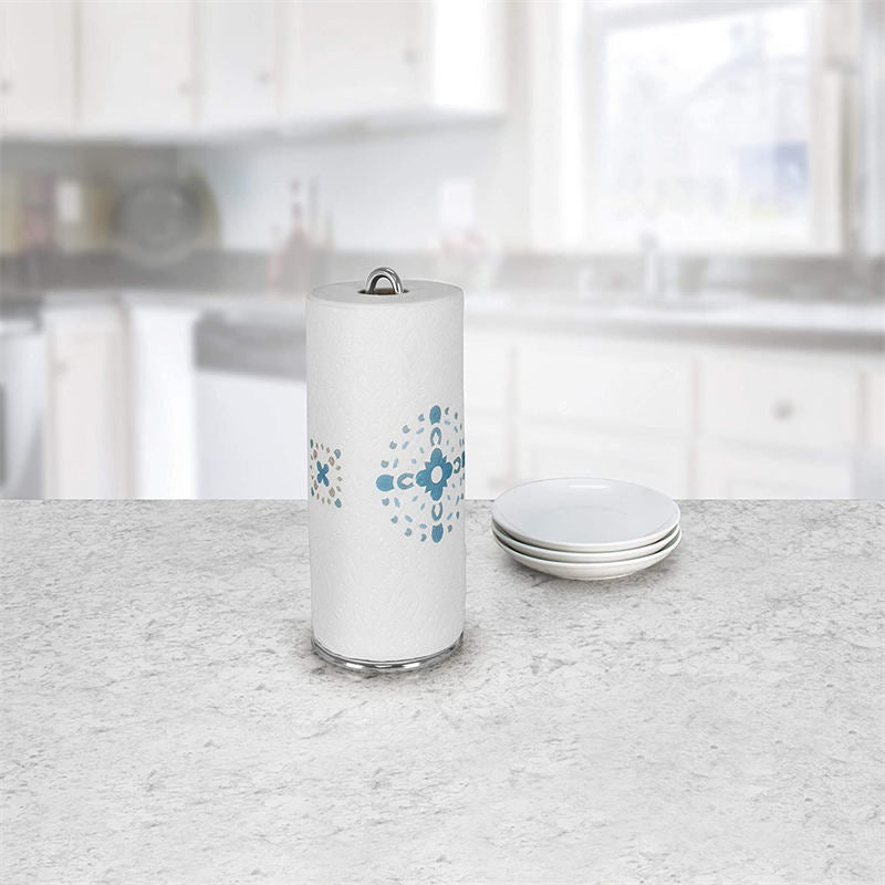 - STYLISH COUNTERTOP ACCESSORY: With a minimalist design and contemporary finishes, this paper towel holder will look beautiful in any kitchen. The compact holder will take up little space on your countertop or dining table, leaving more space for food, decor, or storage items. The sleek sturdy steel looks modern while boasting old-fashioned durability. The circular base does not lean or tip, making it easy to tear off a paper towel when you need it.