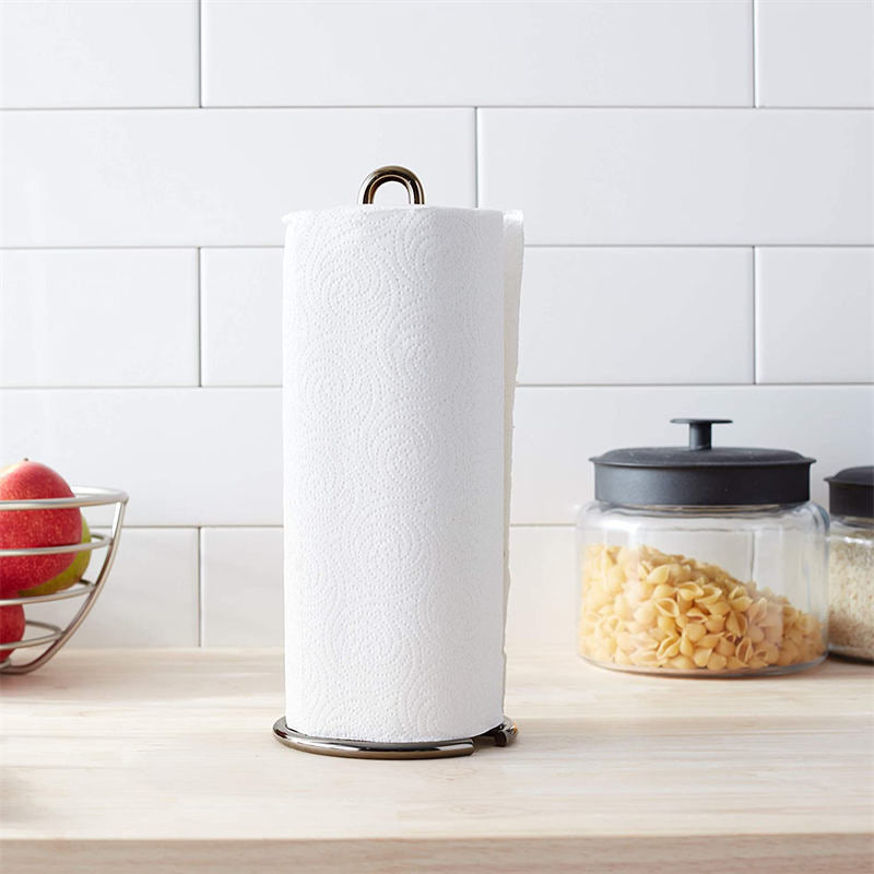 - STYLISH COUNTERTOP ACCESSORY: With a minimalist design and contemporary finishes, this paper towel holder will look beautiful in any kitchen. The compact holder will take up little space on your countertop or dining table, leaving more space for food, decor, or storage items. The sleek sturdy steel looks modern while boasting old-fashioned durability. The circular base does not lean or tip, making it easy to tear off a paper towel when you need it.