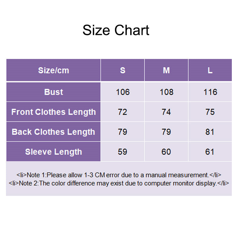 - Size: S/M/L, Please choose the right size according to the size chart, we will ship according to your order.