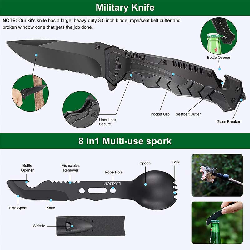 - Survival Gear And Equipment. Our emergency kit contains the most popular camping accessories: Wire Saw,Survival Bracelet,Flashlight Multifunctional Card,Emergency Blanket,carabiner,Fishing Hook,Fishing Weight,Fishing Float,Bait ,Fishing Lines,Fire Starting Stick,Tactical Pen£¬Floding Military Knife,7 in 1 multi use spork,Fire Starer,Water bottle clip,Pocket Bellow,Screwdriver,Compass.