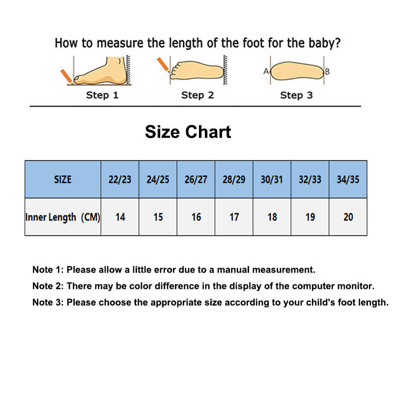 - Please refer to the shoe size chart in the picture before buying shoes to get the correct size. Since the dimensions are manually measured, there may be some errors. Please measure the length of your child's feet to get the best fit. Due to the different display and lighting effects of the monitor, the picture may not reflect the actual color.