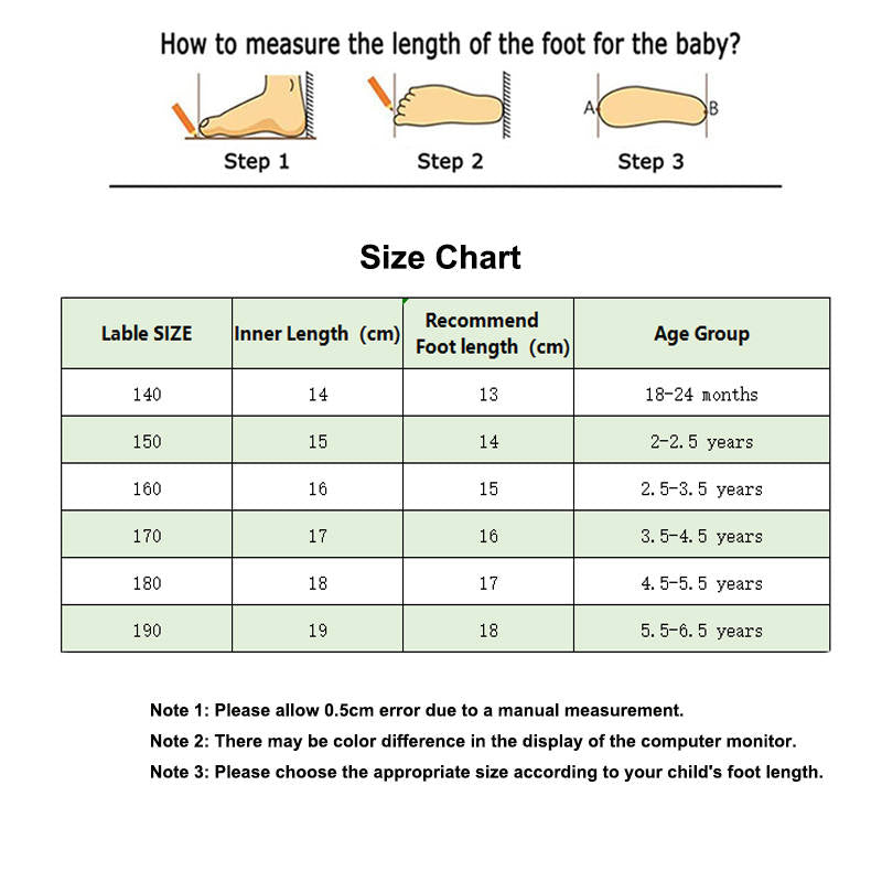- Please refer to the shoe size chart in the picture before buying shoes to get the correct size. Since the dimensions are manually measured, there may be some errors. Please measure the length of your child's feet to get the best fit. Due to the different display and lighting effects of the monitor, the picture may not reflect the actual color.