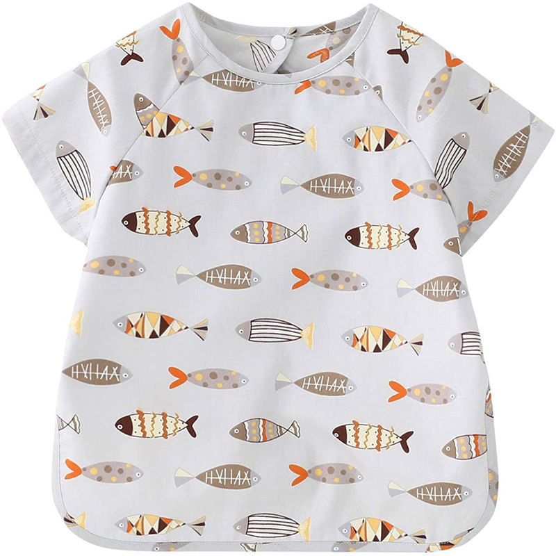 Toddler Short Sleeved Smock Cartoon Waterproof Apron for Feeding Painting-GreyFish