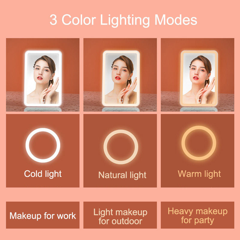 - 3 Color Lighting LED Makeup Mirror: This lighted travel makeup mirror with LED, offers white lights, warm lights and cool lights. Easily switch the color temp between a warm glow to white glow to see how exactly your makeup will look in various lighting situations like daytime, evening,and working environments. The light is natural and soft, bright but not dazzling, protecting your eyes.