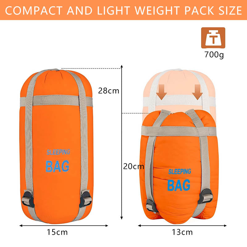 - Lightweight,Small,Easy To Pack.This space-saving summer sleeping bag for men,women,boys and girls can be compressed down to just 20cm height and weighs about 700g. The smallest sleeping bag for backpacking and travel.