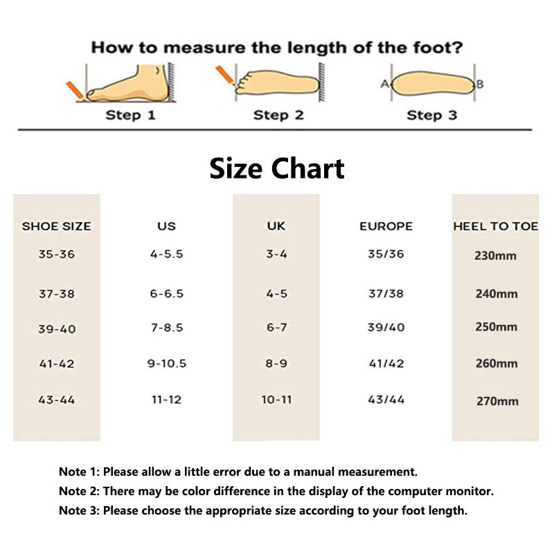 - Please refer to the shoe size chart in the picture before buying shoes to get the correct size. Since the dimensions are manually measured, there may be some errors. Please measure the length of your feet to get the best fit. Due to the different display and lighting effects of the monitor, the picture may not reflect the actual color.