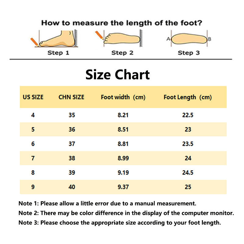 - Please refer to the shoe size chart in the picture before buying shoes to get the correct size. Since the dimensions are manually measured, there may be some errors. Please measure the length of your feet for the best fit. Due to the different display and lighting effects of the monitor, the picture may not reflect the actual color.