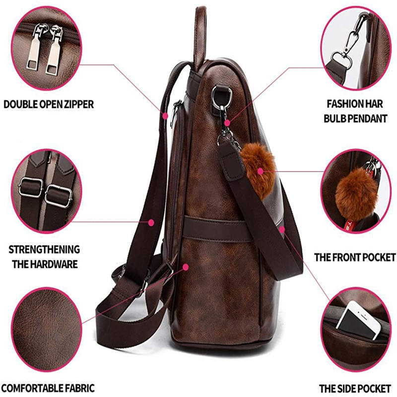 Women Backpack PU Leather Anti-theft Casual Fashion Shoulder Bag-Coffee