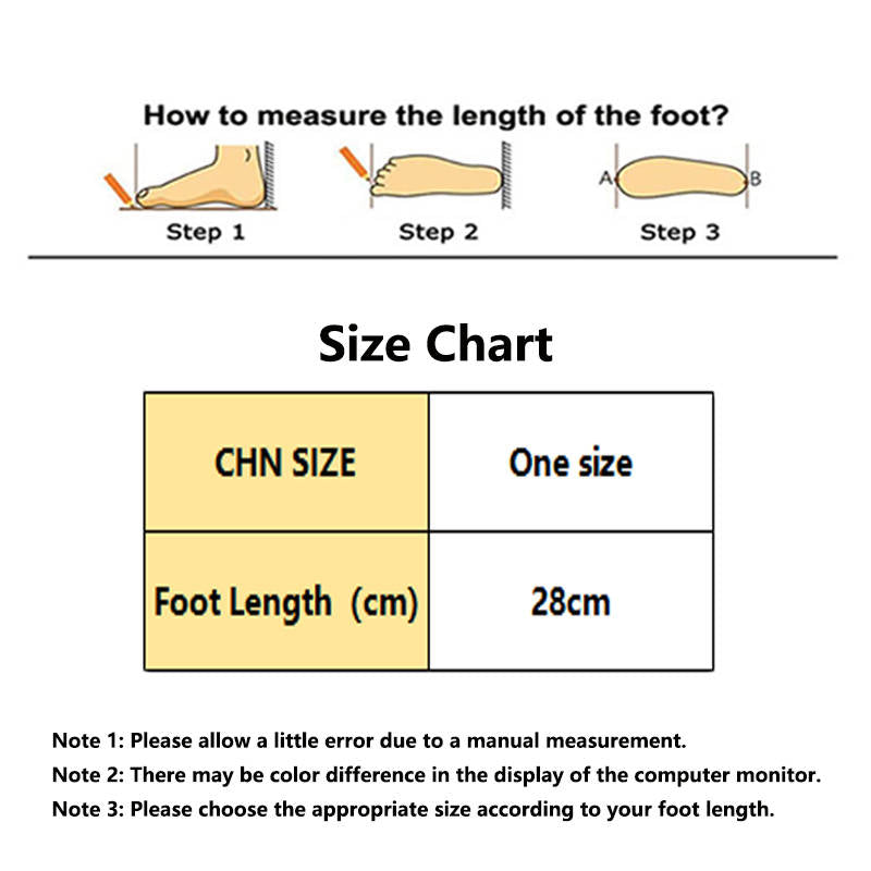 - Please refer to the shoe size chart in the picture before buying shoes to get the correct size. Since the dimensions are manually measured, there may be some errors. Please measure the length of your feet for the best fit. Due to the different display and lighting effects of the monitor, the picture may not reflect the actual color.