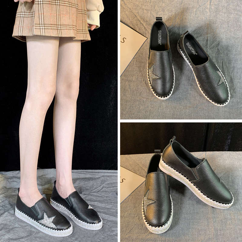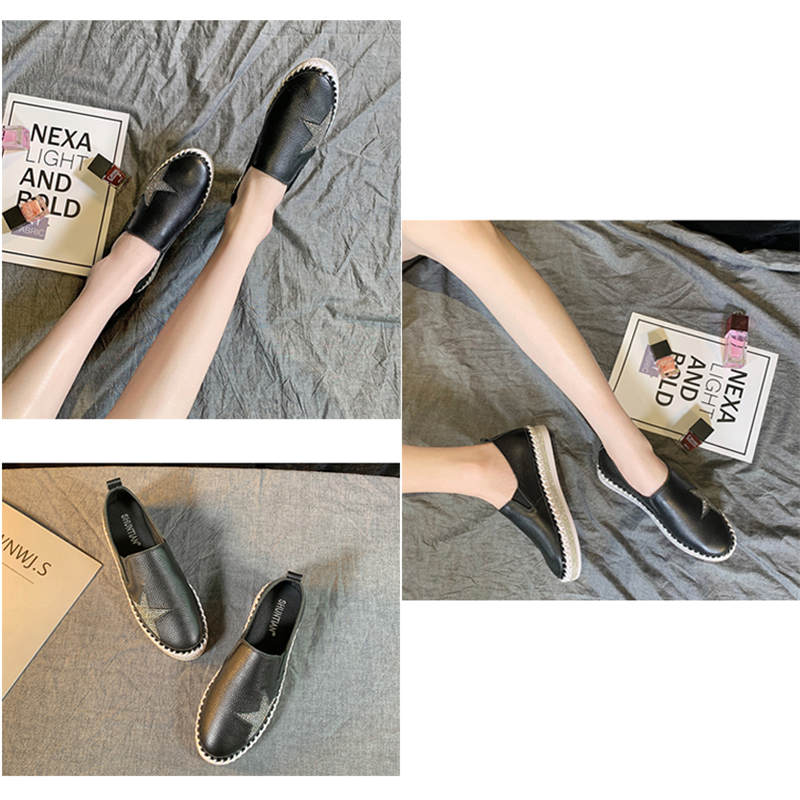 Women Genuine Leather Loafers Low Top Slip On Sneakers-Black