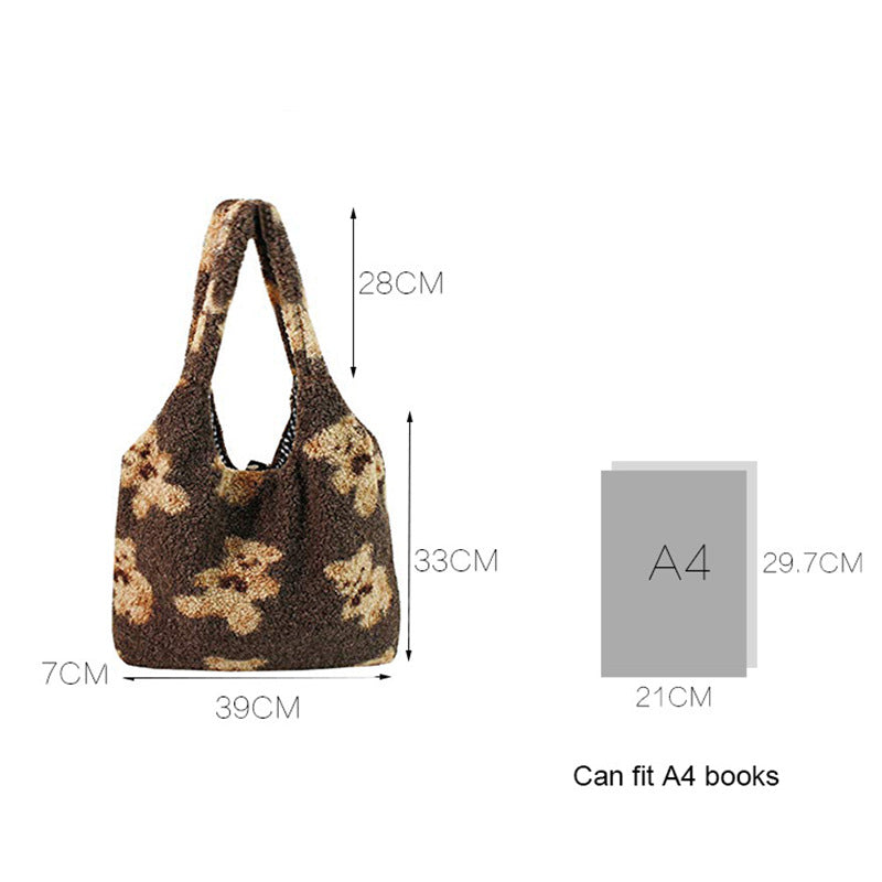 Women Girls Cute Bear Plush Shoulder Bag Large Shopping Handbag-Brown