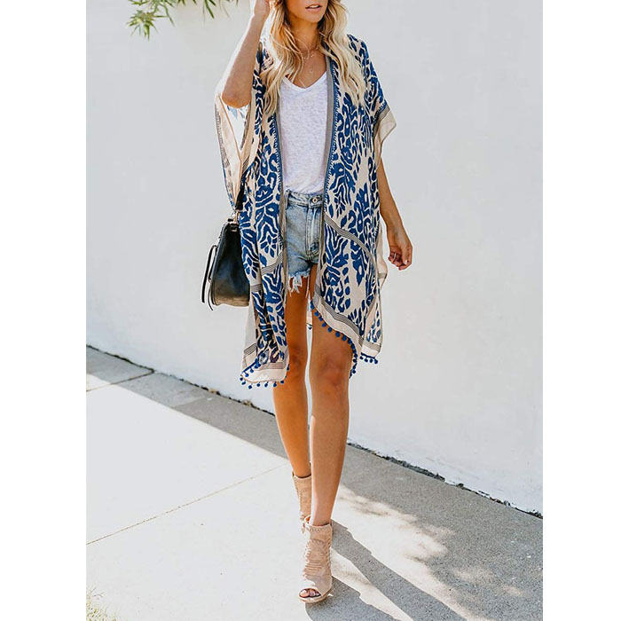 Women Print Kimono Tassel Casual Cardigan V Neck Loose Swimsuit Cover Up Beachwear-Blue
