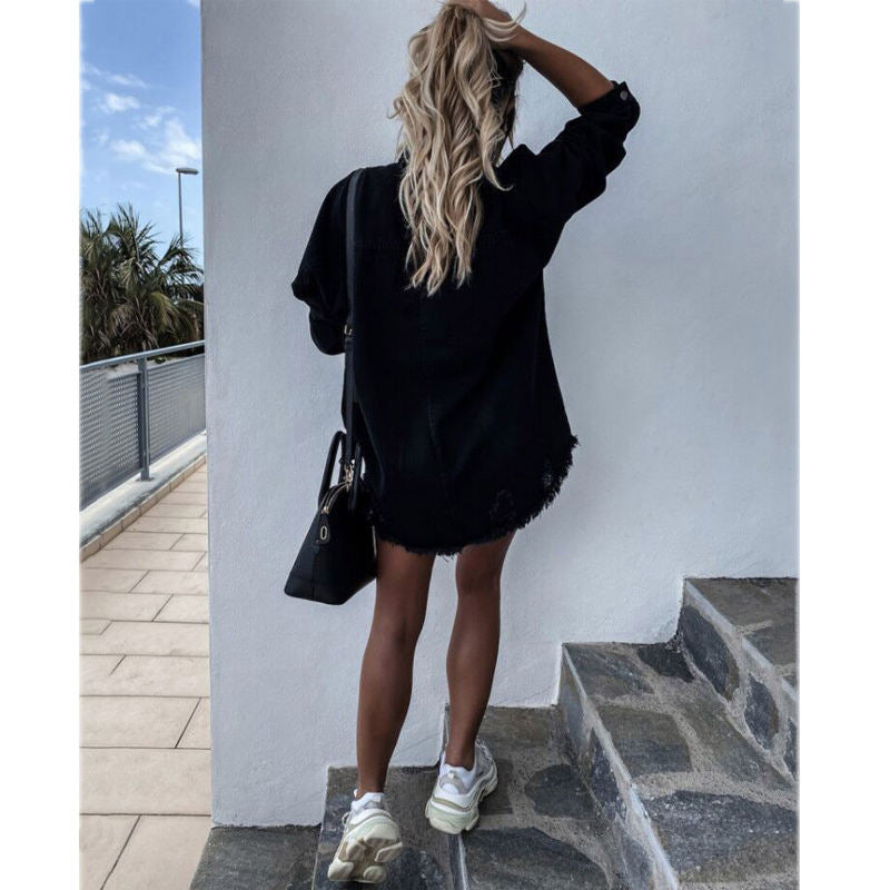 Women Ripped Denim Jacket Boyfriend Mid Long Trucker Coat-Black