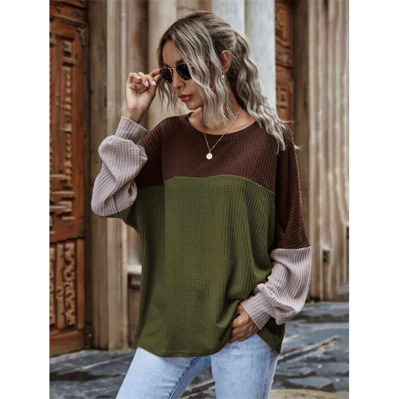 Women Waffle Color Block Sweatshirt Long Sleeve-Army Green