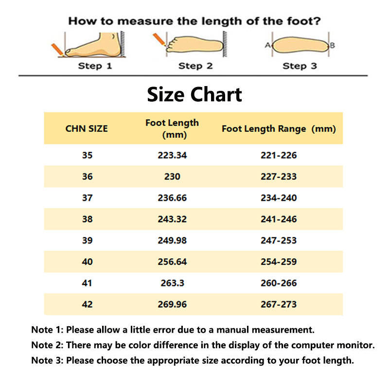 - Please refer to the shoe size chart in the picture before buying shoes to get the correct size. Since the dimensions are manually measured, there may be some errors. Please measure the length of your feet for the best fit. Due to the different display and lighting effects of the monitor, the picture may not reflect the actual color.