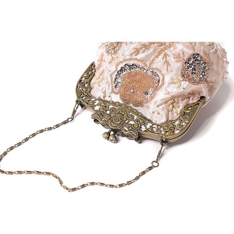 Womens Beaded Party Clutch Vintage Rose Purse-Champagne