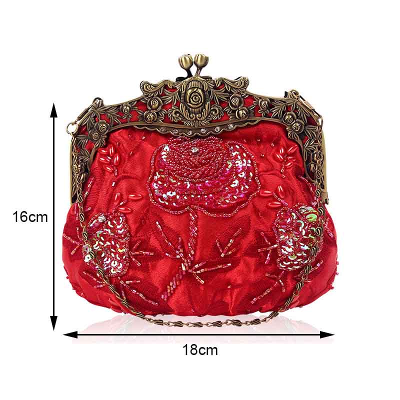 Womens Beaded Party Clutch Vintage Rose Purse-Red