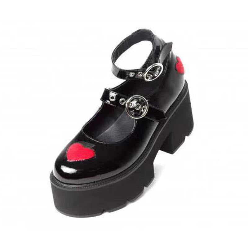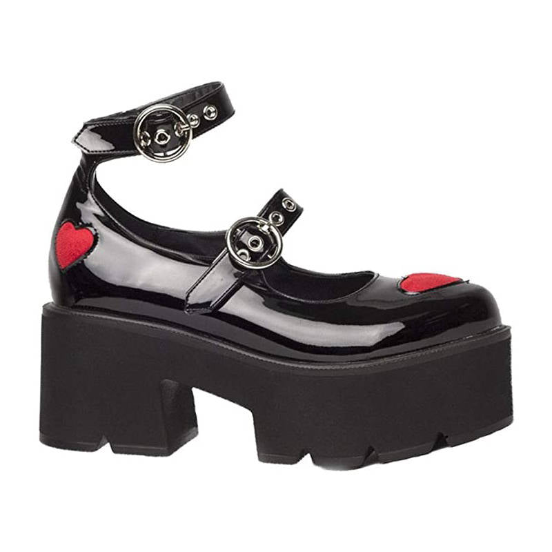Womens Chunky Heel Goth Platform Mary Jane Lolita Wedges Dress Shoes-Heart Black