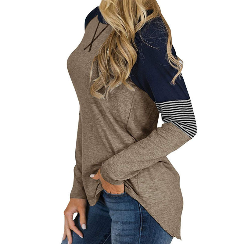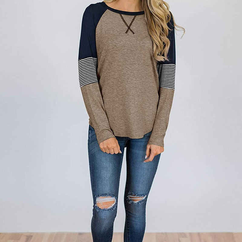 Womens Color Block Round Neck Tunic Top Casual Long Sleeve Shirt-Brown